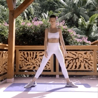 Stand with your feet in a wide stance and your hands in front of your body. This is the starting position.