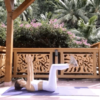 Lie face up with your arms extended toward the ceiling and your legs in a tabletop position (knees bent 90 degrees and stacked over your hips). This is the starting position.
