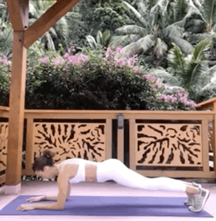 Start in a forearm plank with your forearms on the floor, elbows directly underneath your shoulders, hands facing forward so that your arms are parallel, and legs extended behind you. Tuck your tailbone and engage your core, butt, and quads.