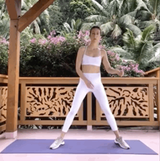 Stand with your feet slightly wider than hip-width apart, toes slightly turned out, arms at your sides, palms in