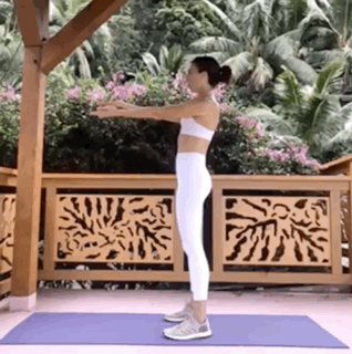 Engage your core and keep your chest lifted and back flat as you shift your weight into your heels, push your hips back, and bend your knees to lower into a squat. Bend your elbows and bring your palms together in front of your chest